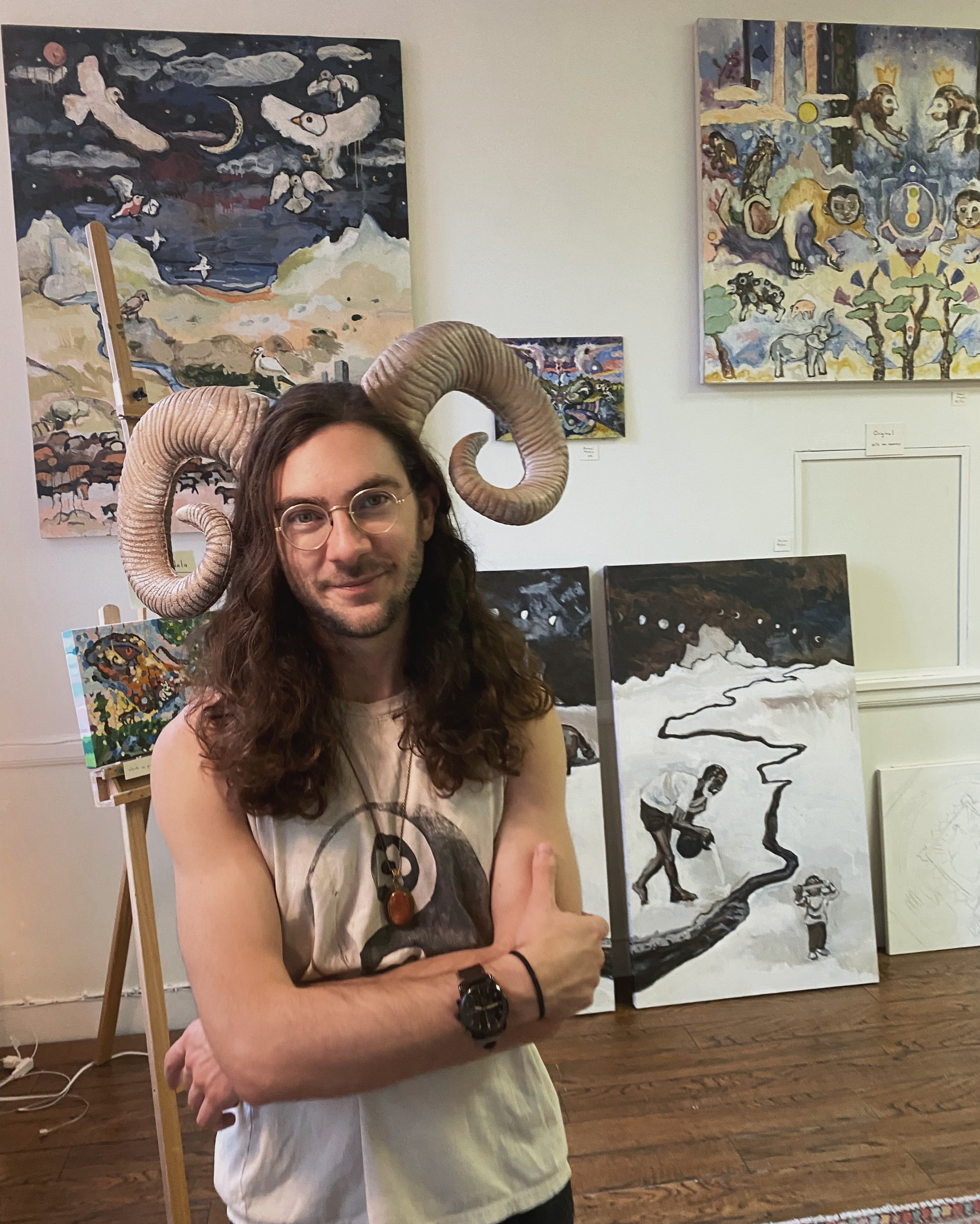 Clark McMillan is a graduate of the BFA program at NSCAD, and is currently living and working as a visual artist in Victoria BC. His large-scale paintings depict a primal and celebratory connection to the animal kingdom, that makes the viewer contemplate their own relationship to the natural world. In looking upon Clark's paintings, one cannot help but feel the vibrant personalities of the animals he depicts, leading to questions of hierarchical consciousness and personal beliefs regarding levels of sentience in living creatures. A colorful palette and loose approach to mark-making paired with mandala-like compositions give his work a sense of spiritual whimsy that is most unique.